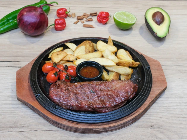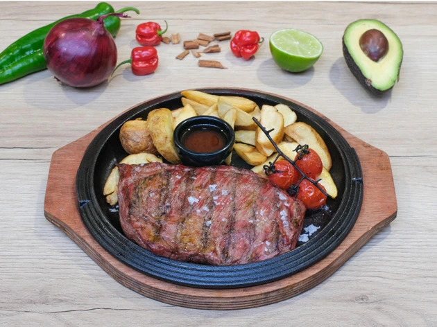 Jugoso chuletón gallego de 500g, acompañado con patatas o ensalada.